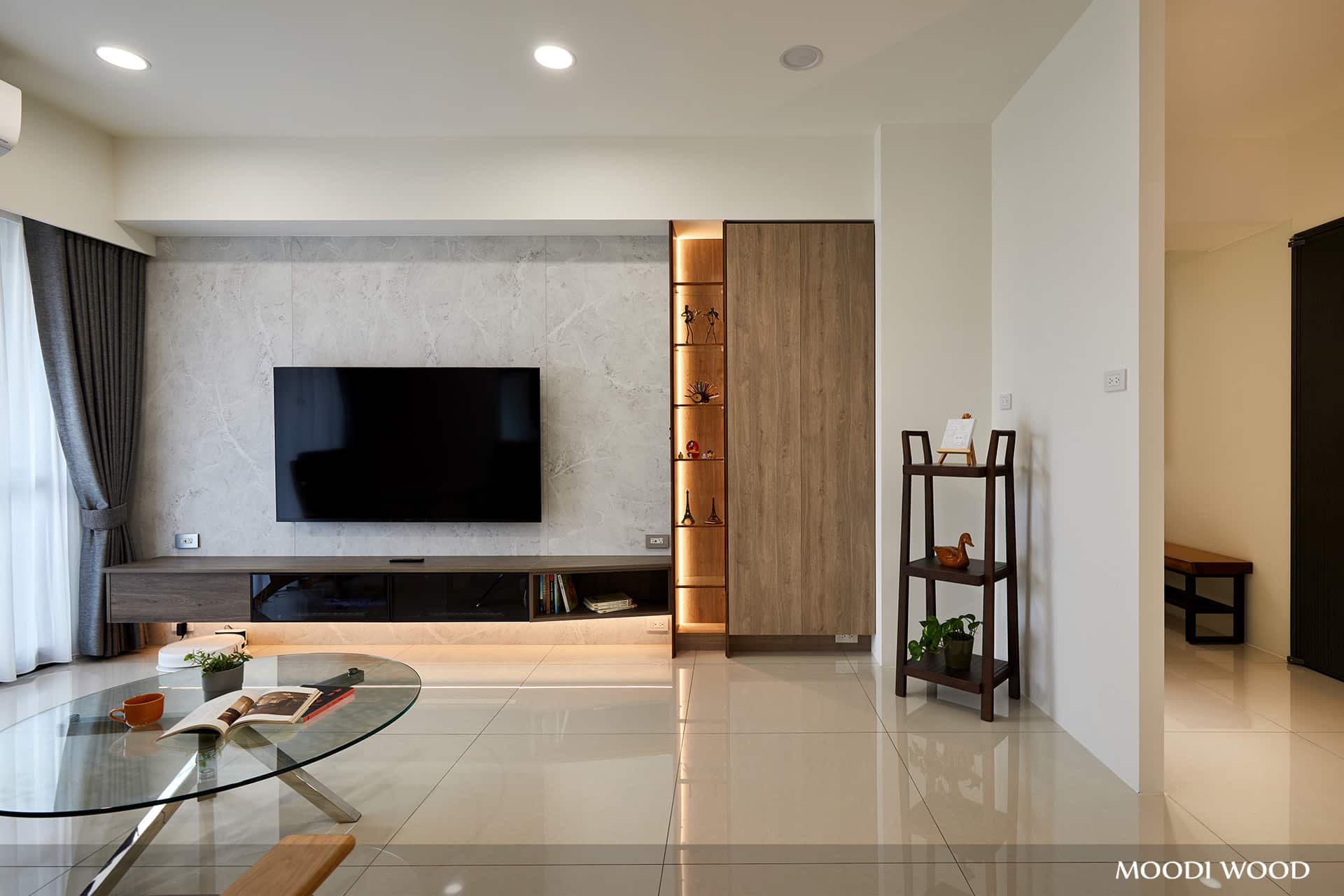 傢櫥設計師運用斜角擺設,讓視覺更舒適、使用更得心應手,同時開放櫃與燈光搭配,營造更美的畫面。