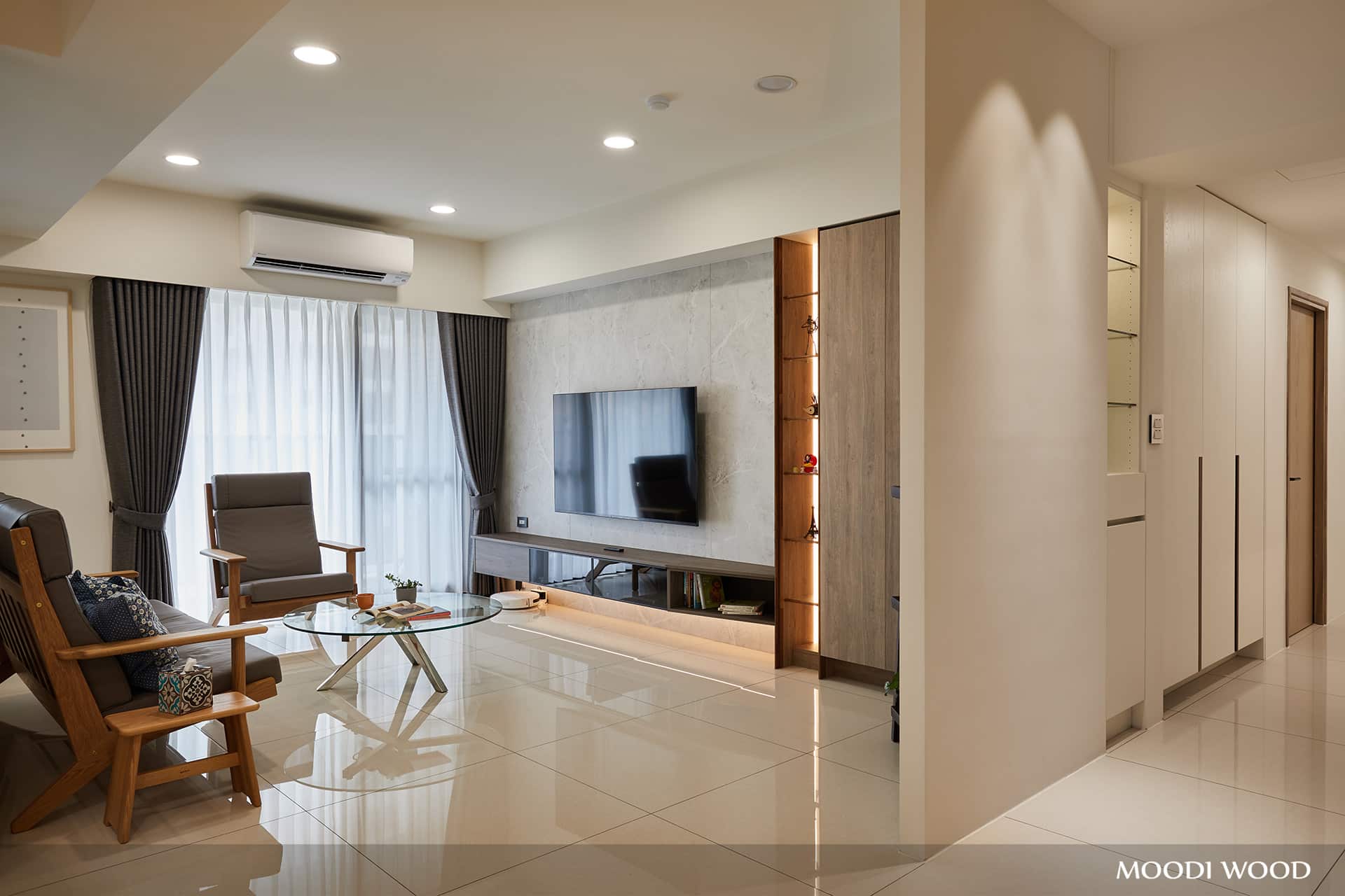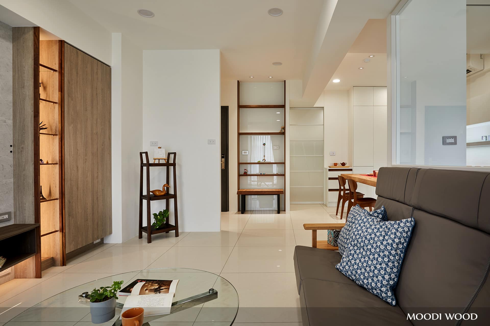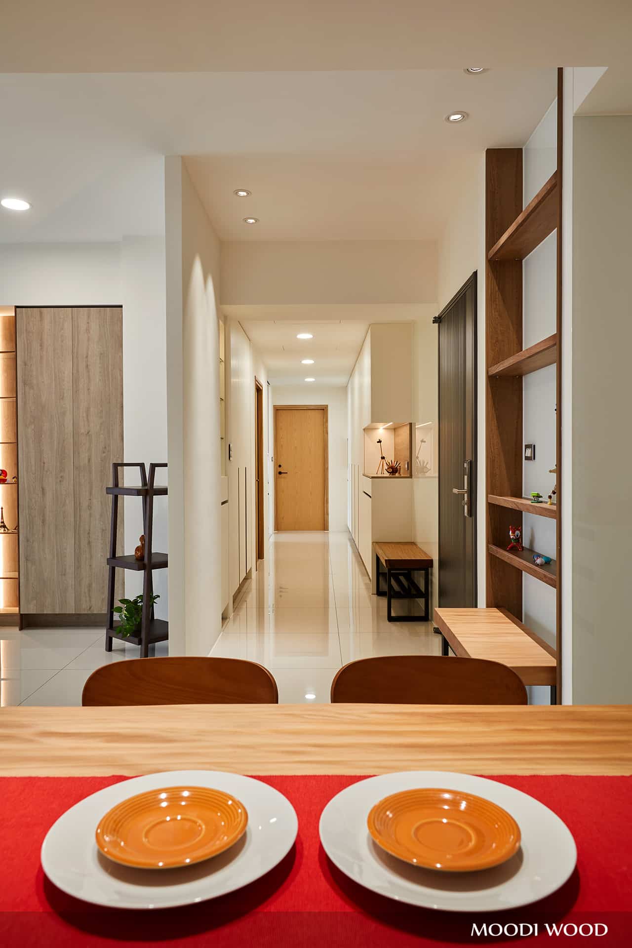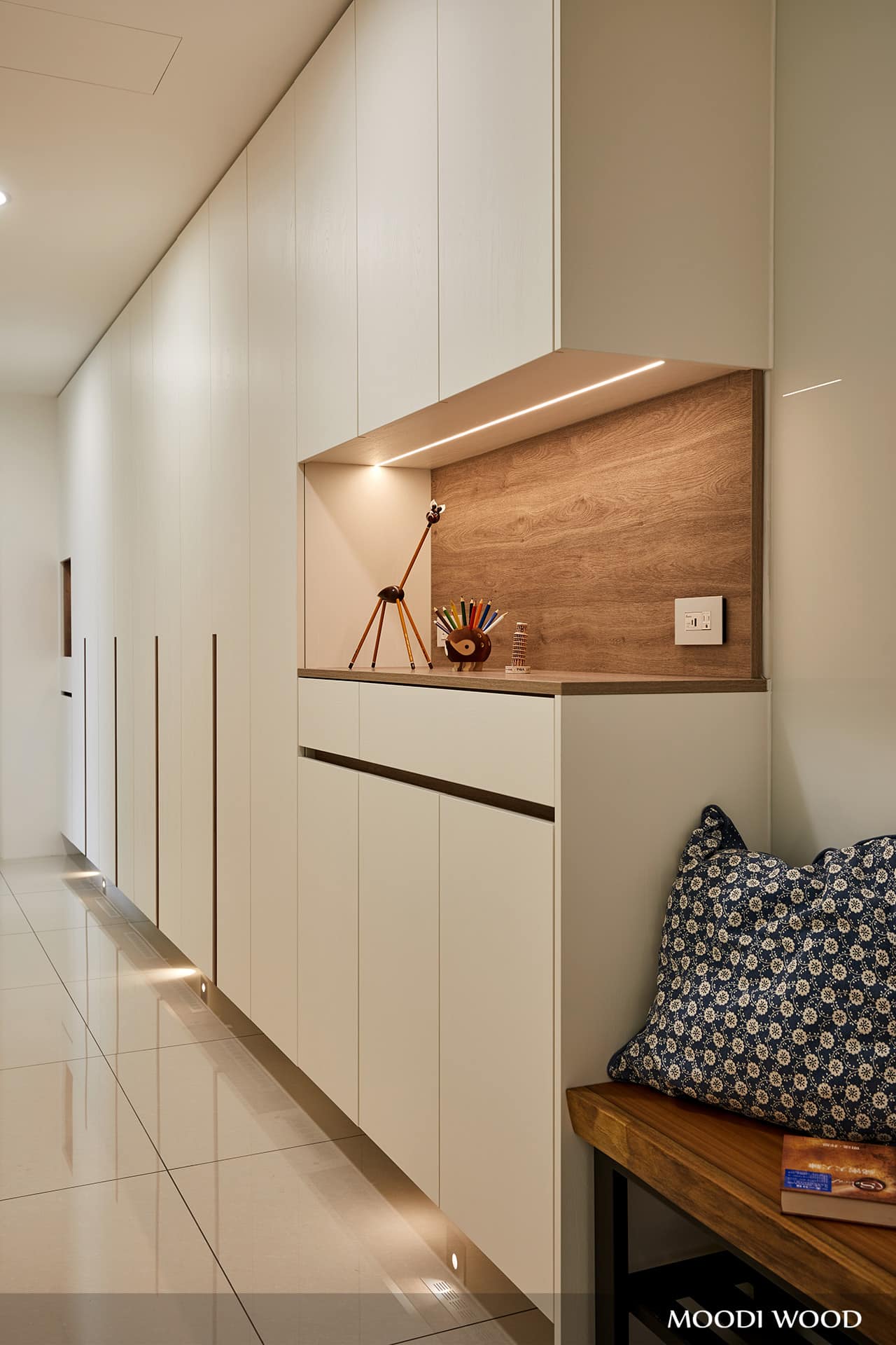 廊道空間運用整排櫥櫃搭配局部開放櫃與燈光設計,此處燈光可選用感應式與計時功能,讓空間更加變化性與舒適感!