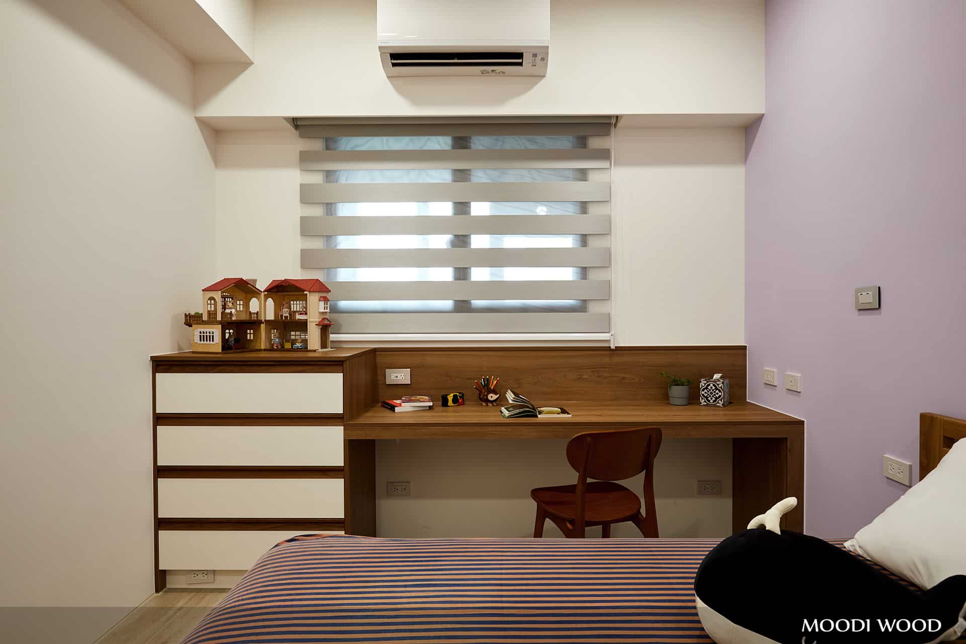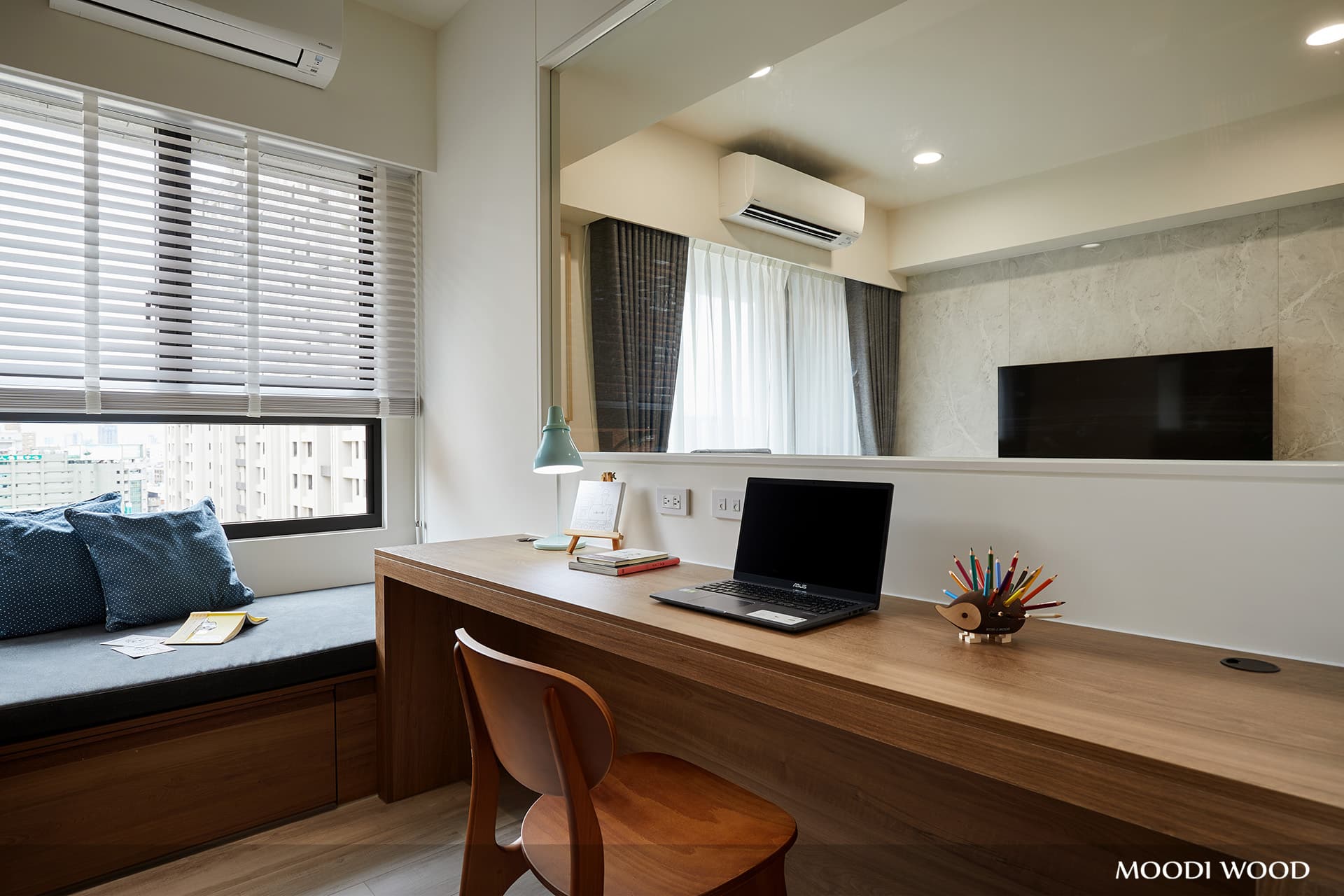 將層板挑高讓你不再為收納造型不同的書本頭痛,搭配暖色橘色調光源,讓房間整體提升更具質感。