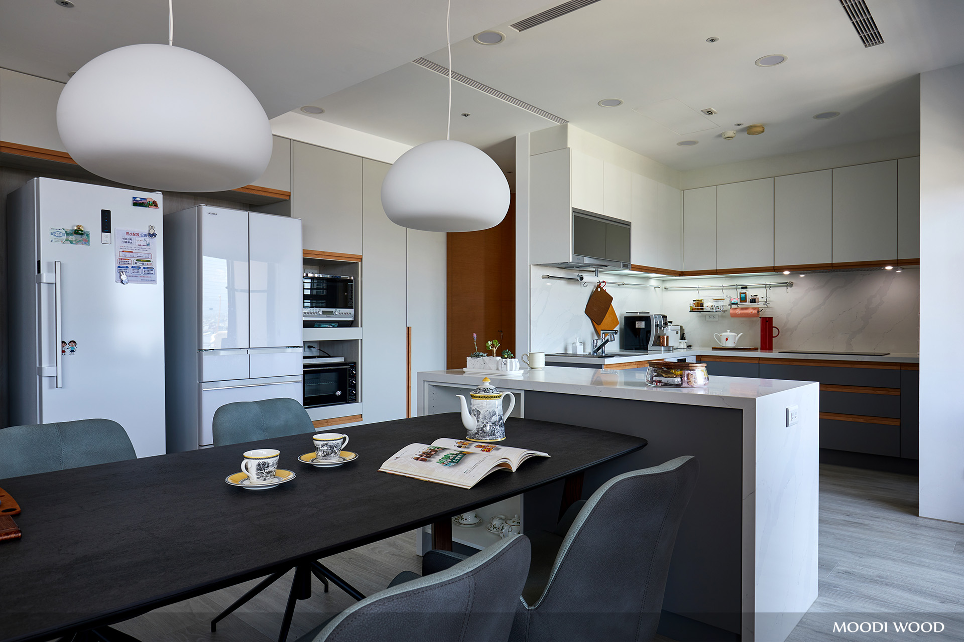 ❶ 開放式的廚房結合客廳的空間需求,主打策略就是讓女主人擁有簡約又好收納廚房設備物品的機能設計,讓廚房的電器及兩台冰箱位於最好用的地方,達成每個人想擁有的中島設計需求,餐桌區的情境是為了一家人及好姊妹話家常聚聚聊天的好所在。