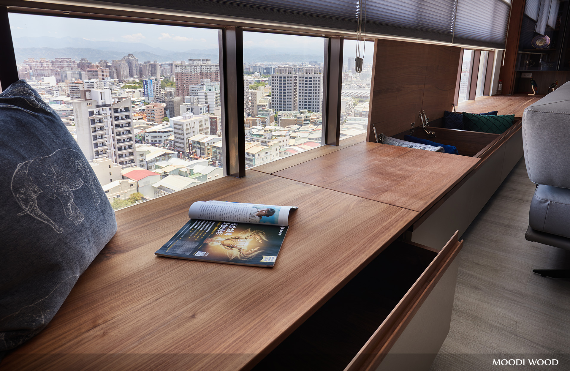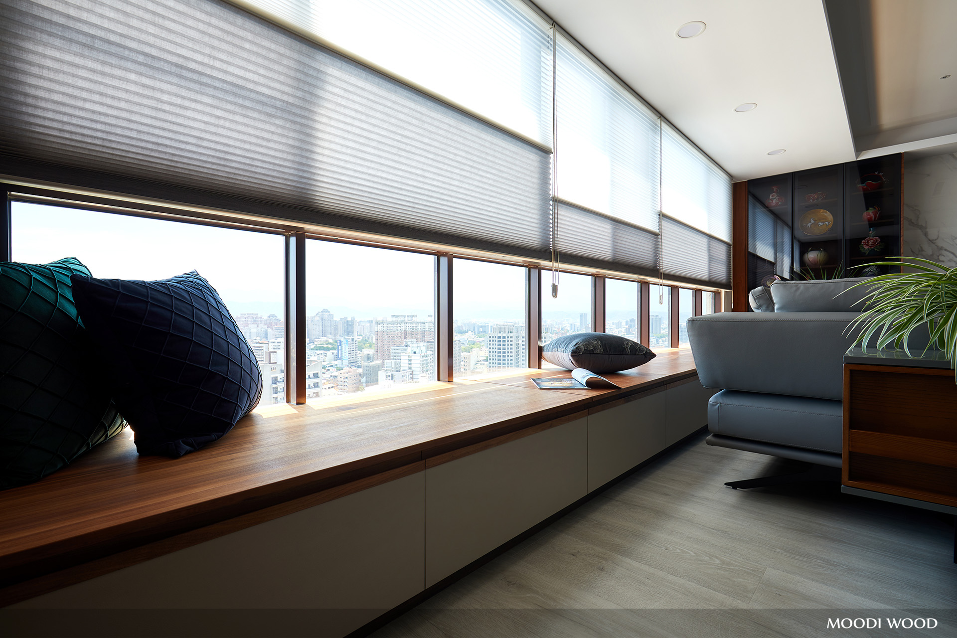 ❸ 客廳區大面窗的景色結合胡桃木臥榻櫃的設計,讓業主保留了視野採光的奔放感受,朋友來訪時也能感受其中,增加互動的連結。