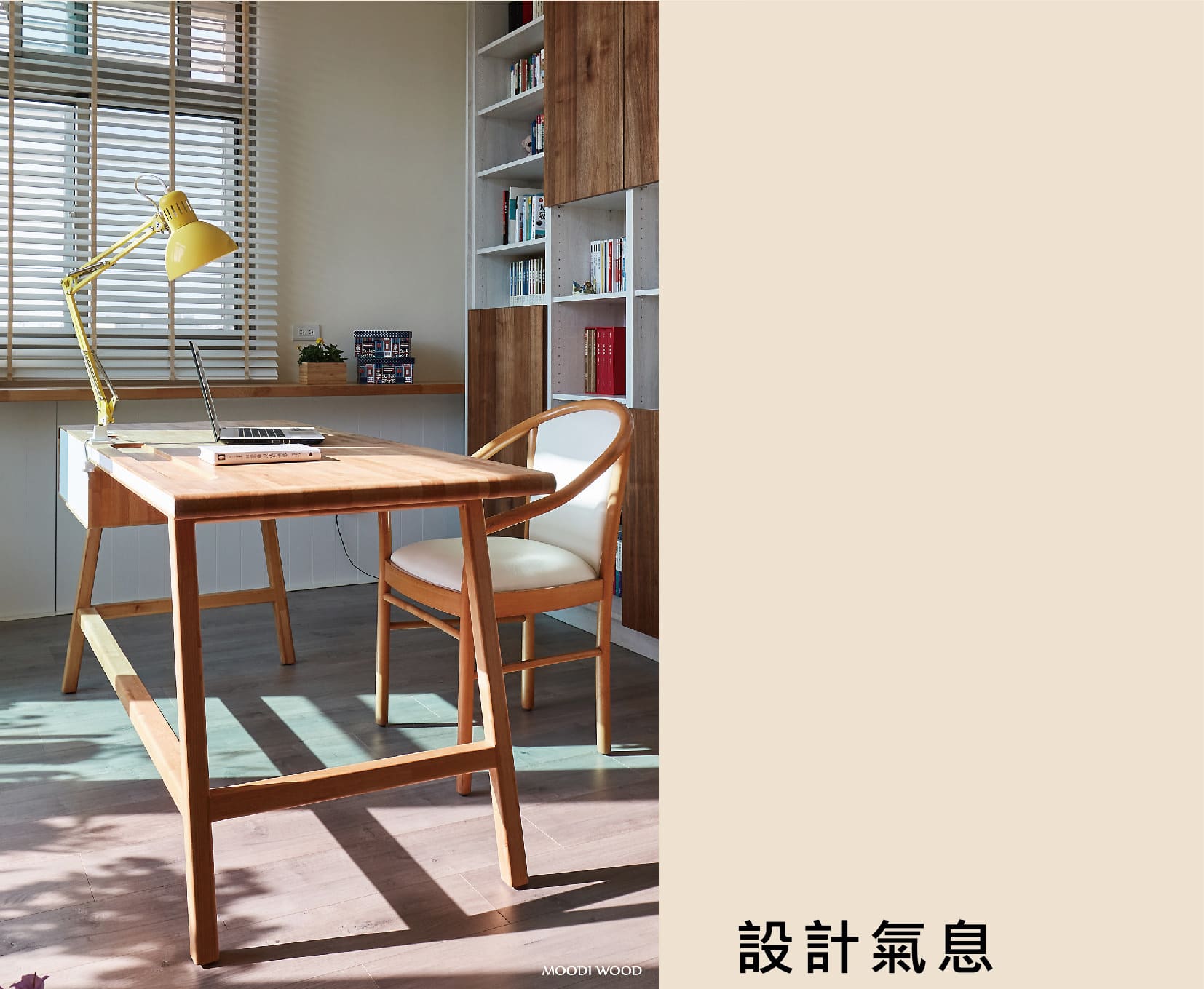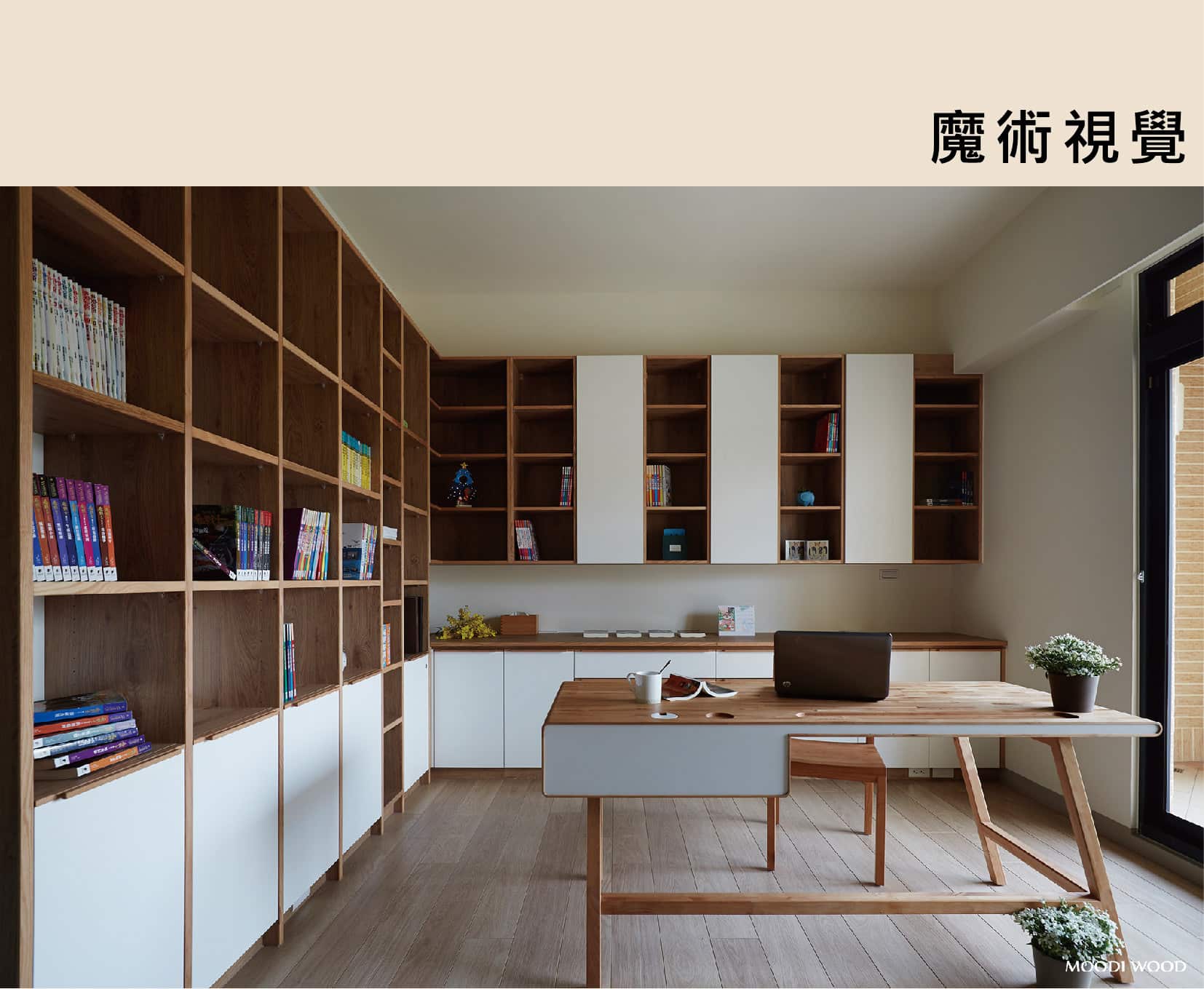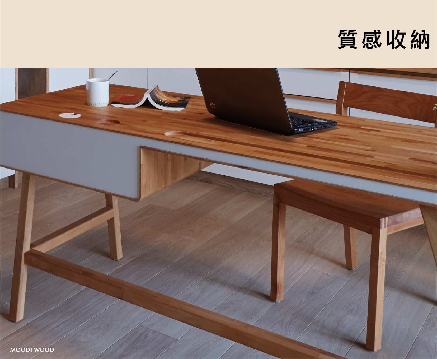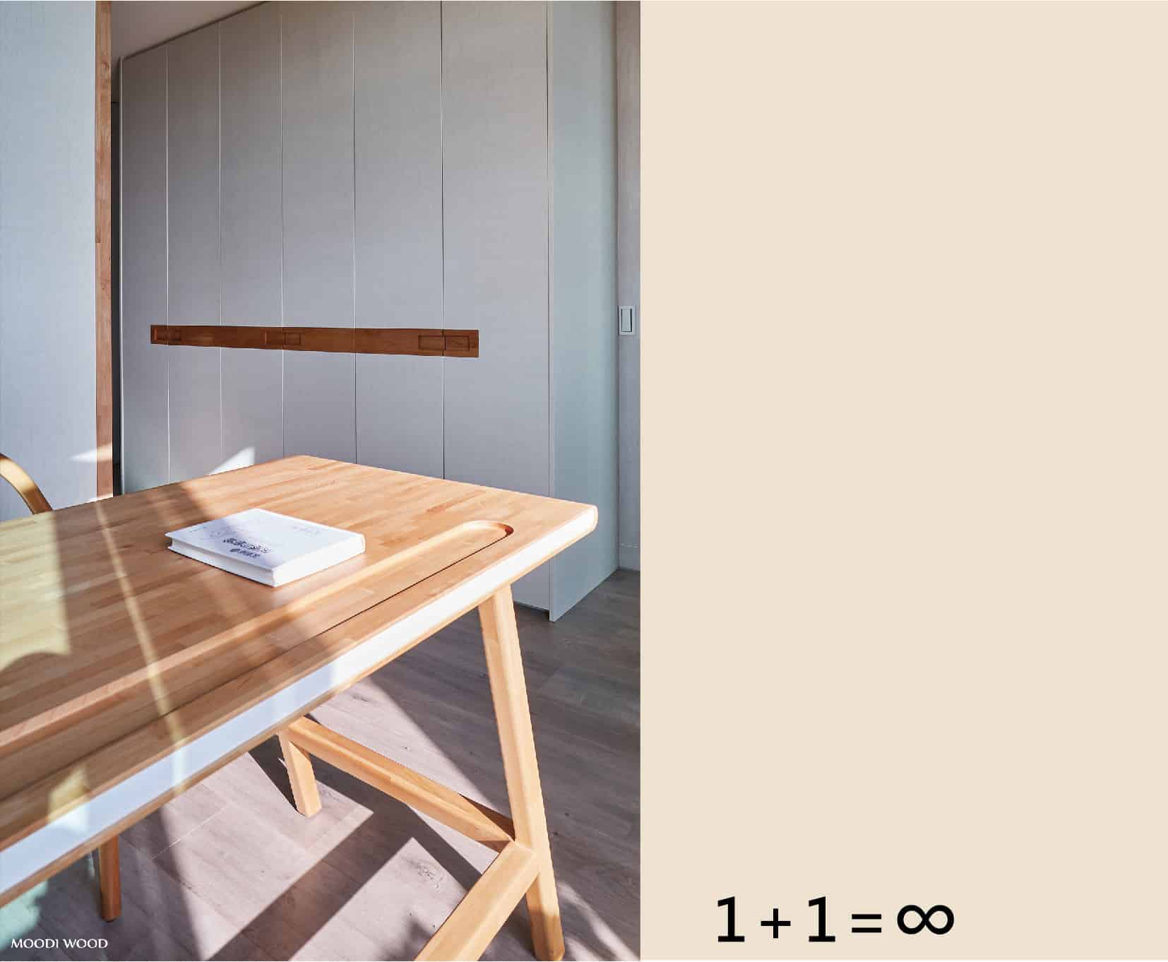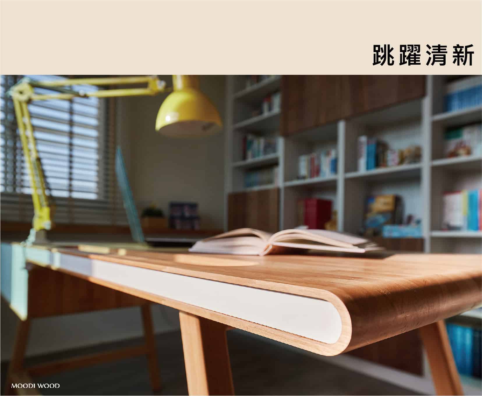 兩種不同的材質搭配,實木與霧面白色面板讓整體輕盈化